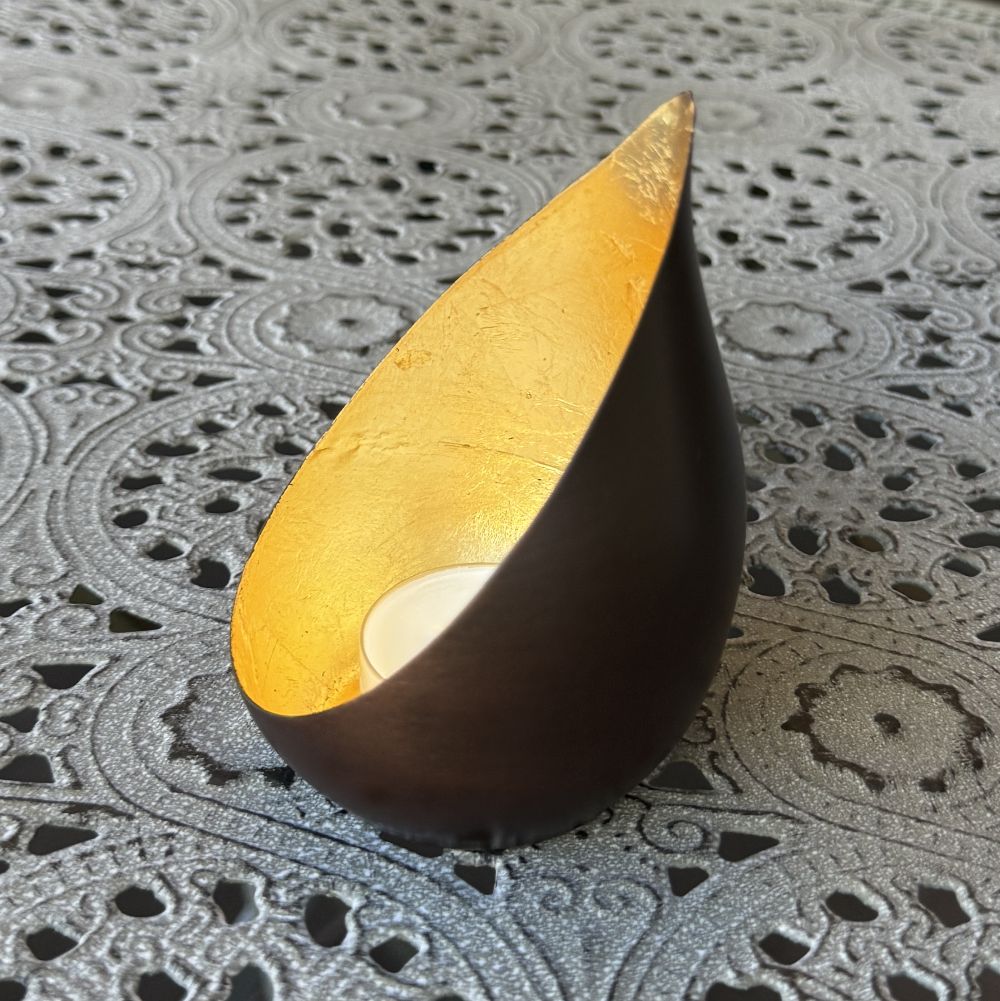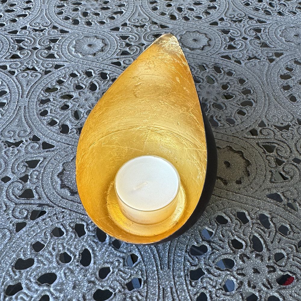 In feinster Handarbeit aufwändig mit Goldfolie gefertigt. Die natürliche Struktur des Goldes reflektiert die Kerzenflamme in faszinierend warmes Licht.